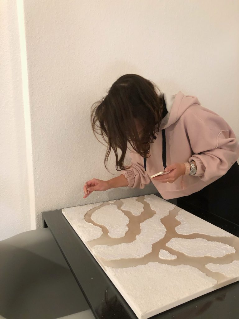 Alle Bilder entstehen in meinem Atelier in Berlin und erzählen eine einzigartige Geschichte. Ich arbeite mit verschiedenen Materialien und Strukturen, um jedem Bild Tiefe und Charakter zu verleihen. Auch die Rahmen werden selbst hergestellt und können individuell angepasst werden. Der Prozess von der Vision bis zum fertigen Bild dauert oft Wochen lang und enthält die Inspiration von Menschen, der Natur und dem Leben. Bei Auftragsarbeiten lege ich besonderen Wert darauf, mich mit dem Auftraggeber oder der beschenkten Person auseinanderzusetzen. Auf diese Weise entsteht ein individuelles Werk, in dem sich etwas widerspiegelt, das einmalig ist.